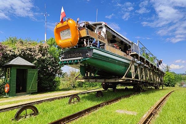 - Then, after approximately 200 m, the vessel enters a larry car. The boat on the car is pulled out of the water along the railway rails with the help of hydraulic devices. We cover a 490 m long route on dry land from the top of the longest Buczyniec Slipway to the bottom, where we descend by nearly 21 m.