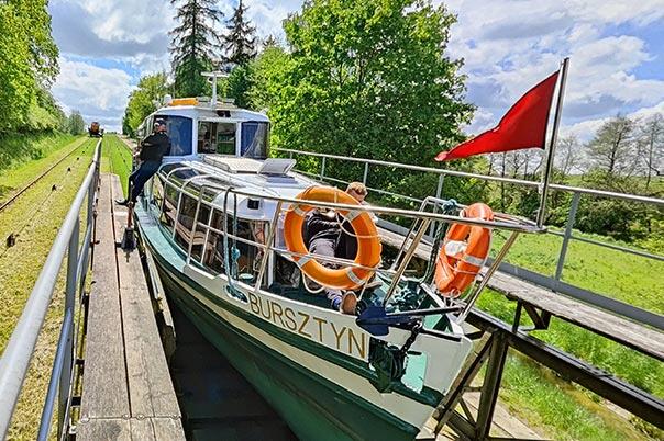 - Zwieńczeniem naszej wycieczki Statkiem po trawie jest Pochylnia Buczyniec „serce” Kanału Elbląskiego. Podróż tą pochylnią będzie trwała najdłużej, ponieważ do jej pokonania wózek szynowy przejedzie blisko 490 m. i wzniesie się o kolejne 21 m. Za szczytem pochylni Buczyniec nasz wspólny rejs dobiega końca na przystani statku Zefir.