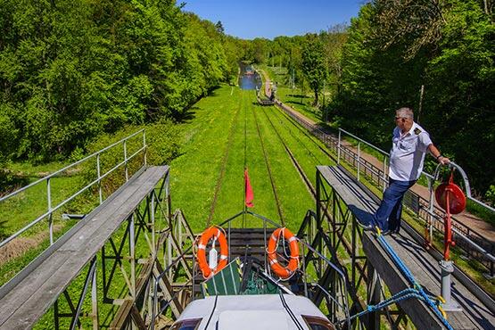 - Jednostka Zefir wpływa na wózek pochylniowy. Za pomocą urządzeń hydrotechnicznych, statek na wózku wyciągany jest po szynach kolejowych z wody. Suchym lądem pokonujemy trasę z dołu do góry o długości około 350 m i wznosimy się o 13 m. Po dotarciu na szczyt wzniesienia wypływamy z wózka, by drogą wodną Kanału Elbląskiego pokonać kolejno następne pochylnie: Jelenie o długości 433 m. i wysokości 22 m.; Oleśnica o długości około 480 m i największej wysokości 24 m; Kąty o długości około 404 m i wysokości 19 m.