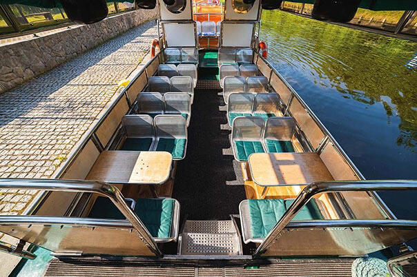 Während der Fahrt entlang des Oberlandkanals begleitet der Schiffskapitän die Gäste mit einem Kommentar. An Bord können heiße und kalte Getränke vom Buffet erworben werden.