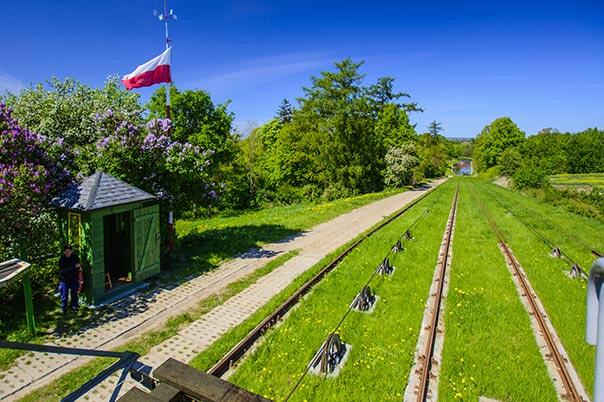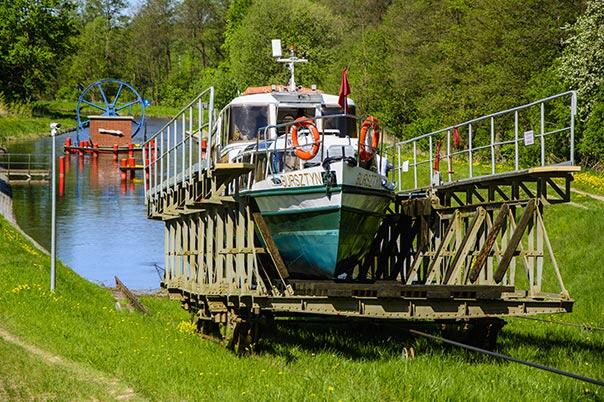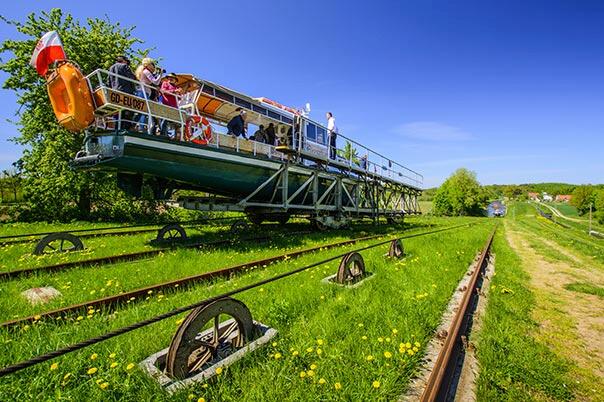 - Nachdem wir die Wagenplattform verlassen haben, fahren wir etwa 2 Kilometer entlang der Wasserstraße des Oberlandkanals zur nächsten geneigten Ebene in Kąty (Kanthen). Hier wird das Schiff zum zweiten Mal auf einer Wagenplattform geparkt. Diesmal beträgt die Rollstrecke 404 m und der Höhenunterschied erreicht fast 19 m.